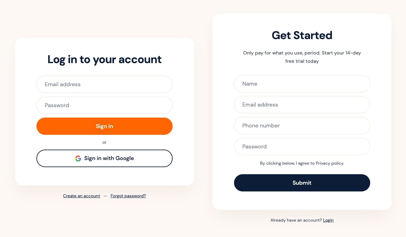 The template does not include any code for signing up, logging in, creating an account, or forgot a password.